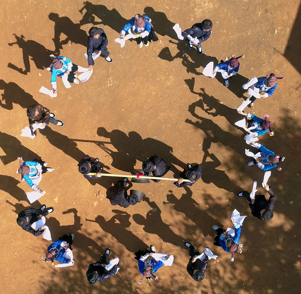 彝族铜鼓舞也多为原始狩猎采集、撒荞烤火等生产、生活动作。演奏铜鼓时多为两人配合敲击,将铜鼓横悬地面,用竹条敲击鼓腰,鼓槌敲击鼓中心,按一定节奏让鼓发出不同声响,同时用木盆在鼓腔内推拉,产生动听的滑音、颤音效果。有的地方则加上了宽边锣,铓锣、牛角号、牛皮鼓伴奏,乐队有七八人。
